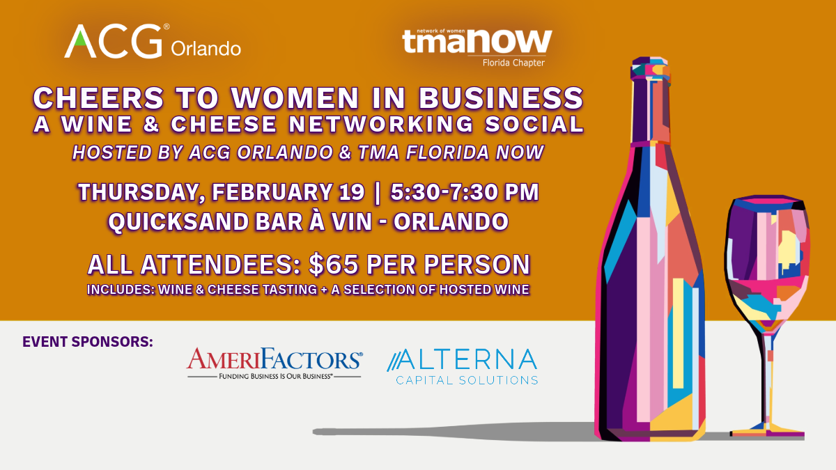Join ACG Orlando and TMA Florida NOW for Cheers to Women in Business, a wine and cheese networking social celebrating connection, collaboration, and community.