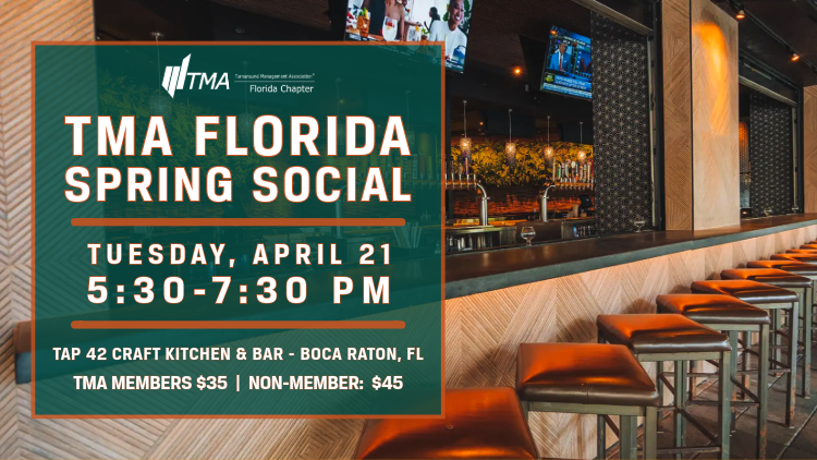 Join TMA Florida for a Spring Social at Tap 42 Craft Kitchen & Bar in Boca Raton on Tuesday, April 21. Enjoy an evening of cocktails, light bites, and networking with professionals from across South Floridaโs turnaround and corporate community. This casual gathering is the perfect opportunity to reconnect with familiar faces and meet new industry peers.