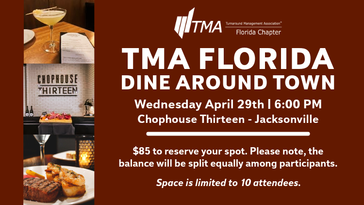 Join TMA Florida for an intimate Dine Around Town dinner designed for meaningful conversation and connection. This small-group networking experience brings together members and non-members for a relaxed evening at Nineteen at Chophouse Thirteen — Jacksonville Steak & Seafood. Space is limited to 10 attendees to encourage genuine dialogue and relationship building.