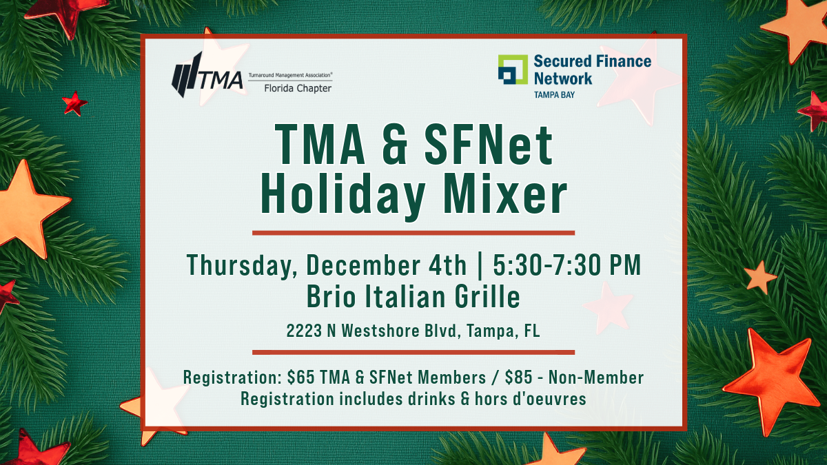 Join TMA and SFNet members and guests for a festive Holiday Mixer at Brio Italian Grille in Tampa on December 4. Celebrate the season, connect with colleagues, and toast a successful year of growth and new opportunities. Enjoy drinks, delicious bites, and great company as we close out the year in style!