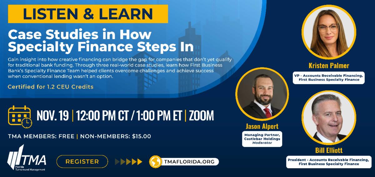Not every business fits neatly into traditional banking criteria. In this Listen & Learn webinar, experts from First Business Bank’s Specialty Finance Team will walk through three real-world case studies featuring companies that were either bank exits or not yet bankable. Discover how flexible financing structures, thoughtful credit decisions, and creative deal mechanics helped these businesses access the capital they needed to grow.