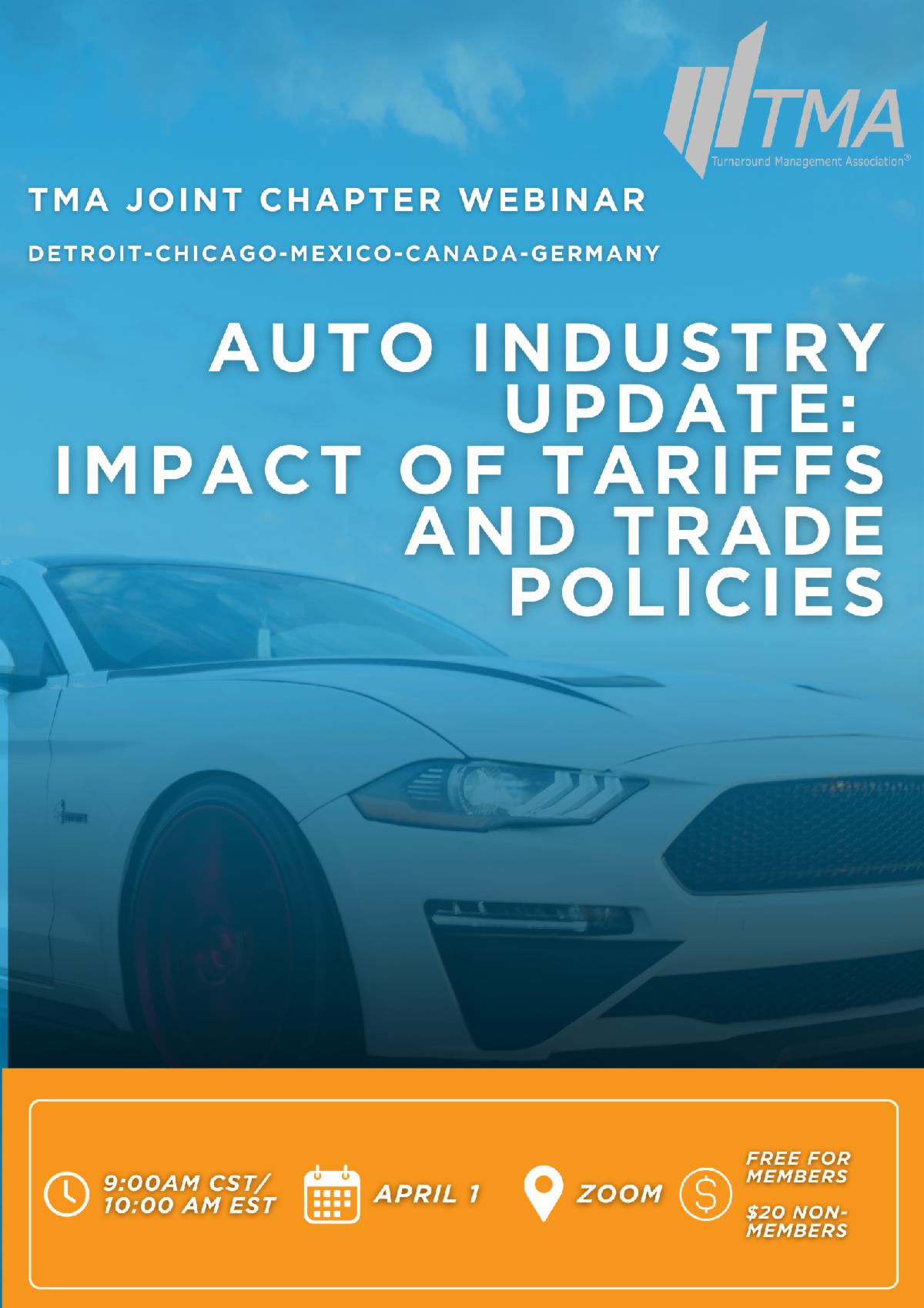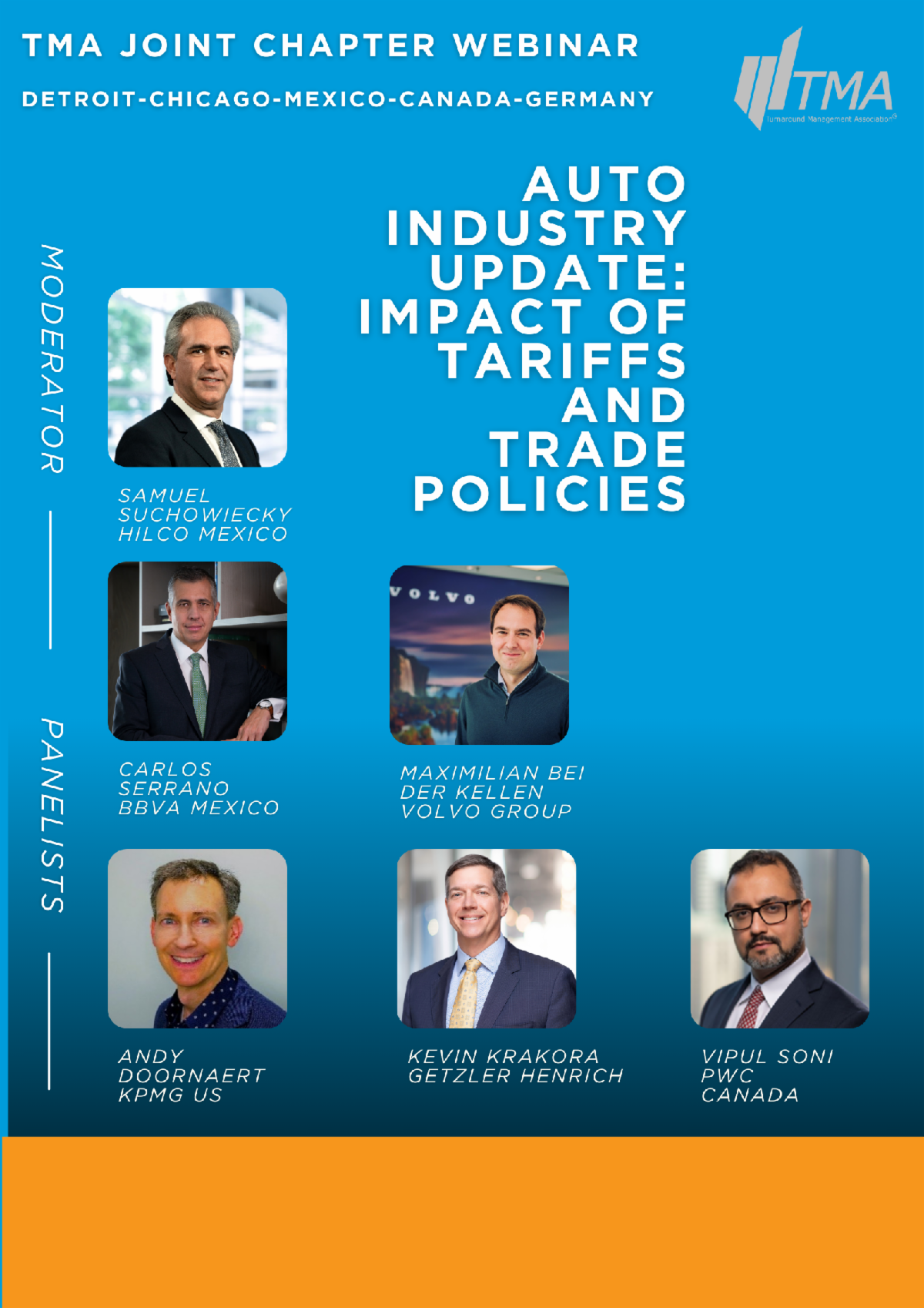 Join TMA chapters from Detroit, Chicago, Mexico, Canada and Germany for an auto industry update about the latest on trade and tariff policies. Given the interconnected nature of the automotive industry and the subsequent flow of goods across borders and oceans we assembled a world class panel to discuss how connected we truly are, what the implications and results are, what it leads to and how companies can react. Our expert panelists feature one of Mexico’s leading economists, an OEM representative, trade & customs experts and business / turnaround experts that will answer the questions you have been waiting to ask. Join us for an additional opportunity to network with professionals from around the world in breakout rooms after the panel discussion.
