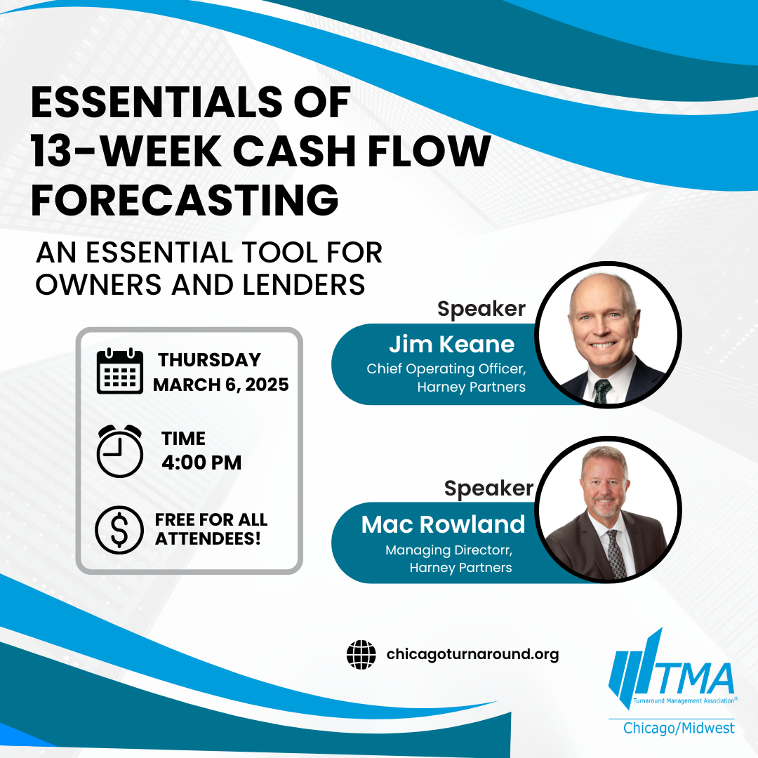 As the expression goes, “Cash Is King” but many business owners and financial managers have managed to grow their businesses without incorporating a standard 13-Week Cash Flow Forecast into their routine financial reporting, so they are not evaluating, understanding, and managing their liquidity using the tool lenders rely on when extending credit. The Chicago Midwest Chapter of the Turnaround Management Association (TMA) is pleased to host a free-for-all 13-Week Cash Flow webinar hosted by Jim Keane and Mac Rowland of Harney Partners, a national middle corporate advisory firm, to provide business owners and financial managers of all sized firms an understanding of the critical drivers of this report, keys to making it more reliable, tips for presenting it to lenders and stakeholders, and the strategic importance of this report for any business.