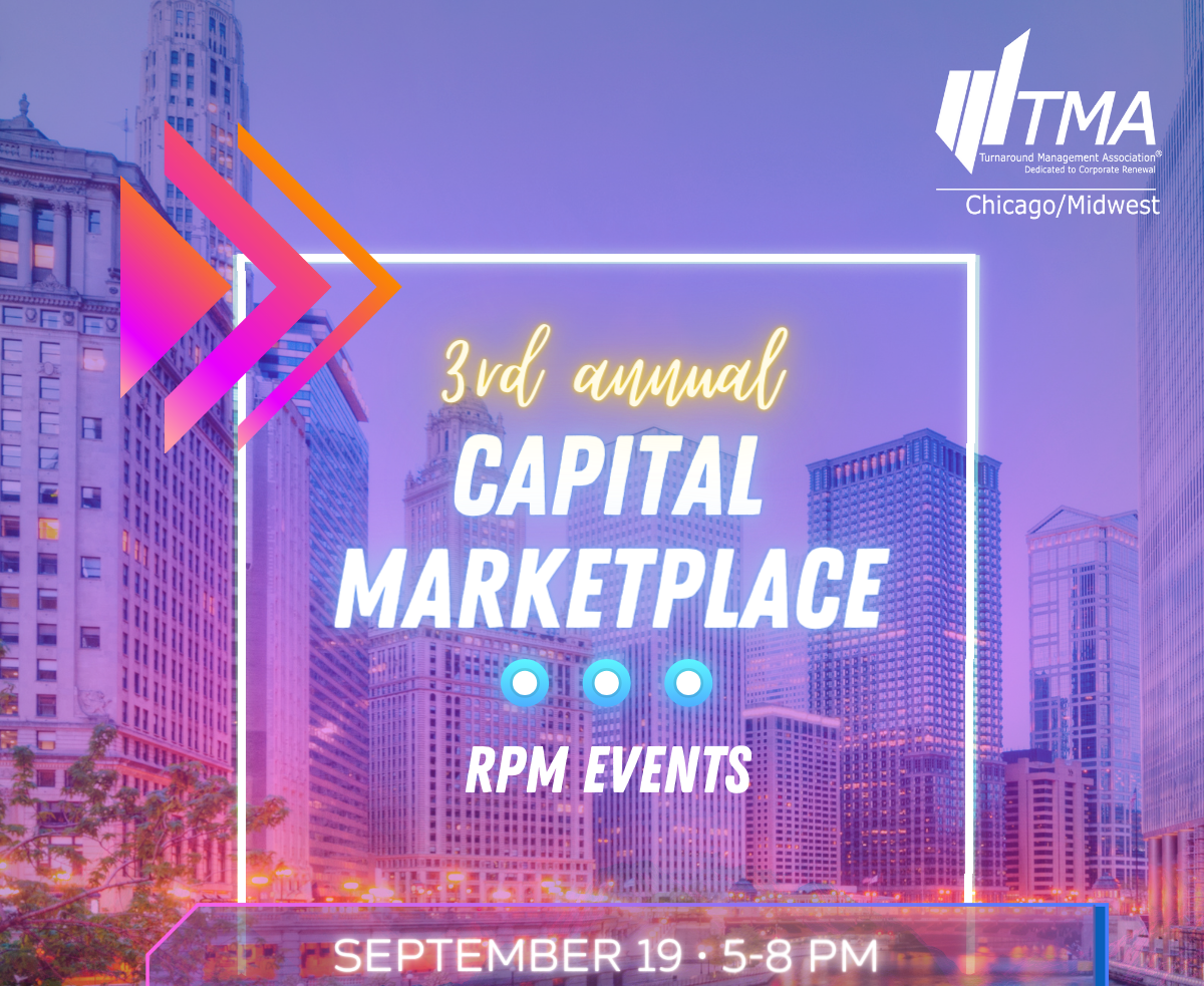 The TMA Chicago/Midwest Chapter is proud to host the 3rd Annual Capital Marketplace Event on September 19, 2024 at RPM Events. The event will feature premier local and national capital providers, investors, private equity, direct lending and distressed debt firms who will showcase their interests and capabilities via introductions and discussions. These firms will prove central to driving deals, business, and opportunity throughout the turnaround community. Don't miss this event!