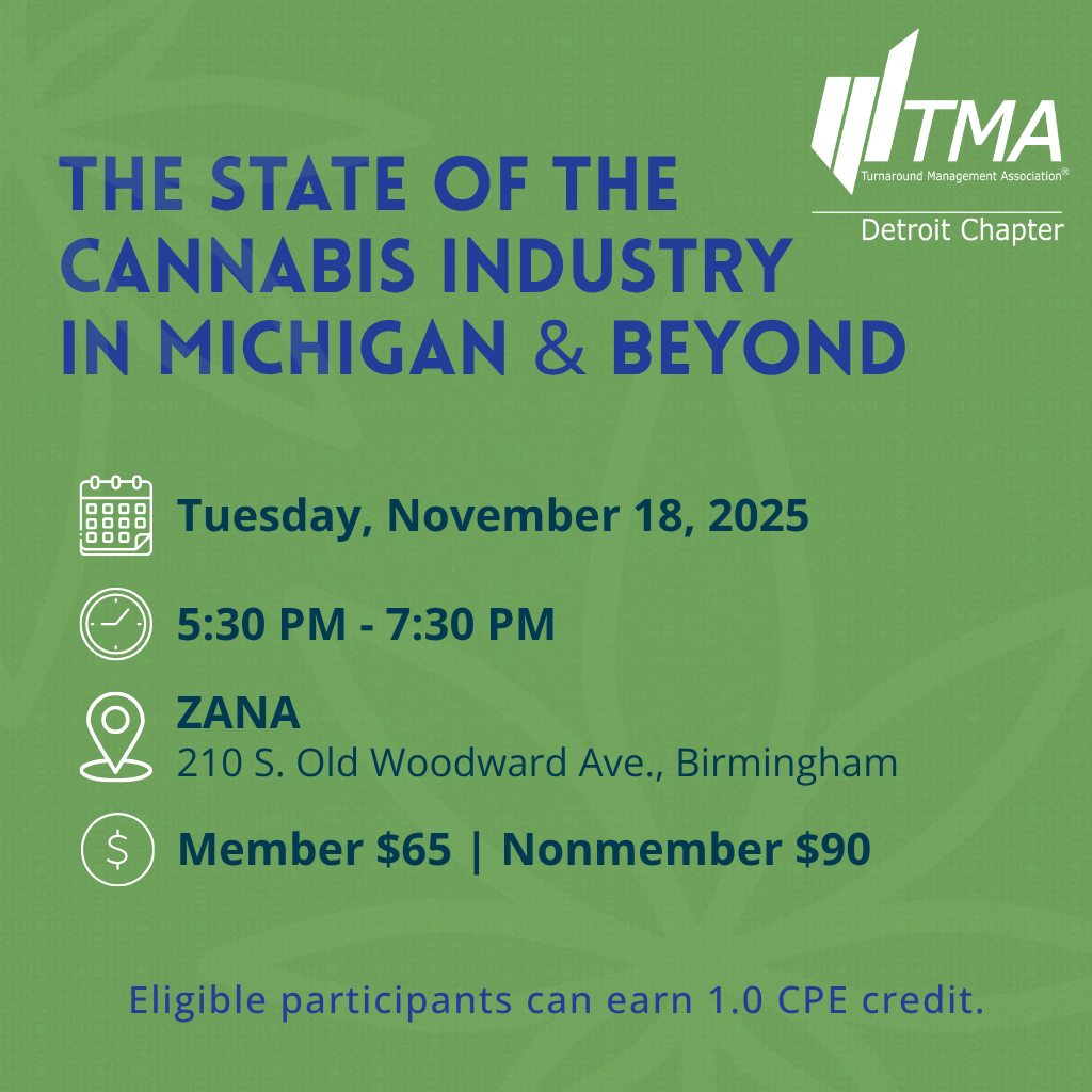 Hear industry insiders discuss the current state of the Michigan cannabis industry from a restructuring perspective. The panelists will discuss: the current economic environment, the impact of state and local taxes and regulations, lending in the cannabis space, and the state of play in neighboring states.
