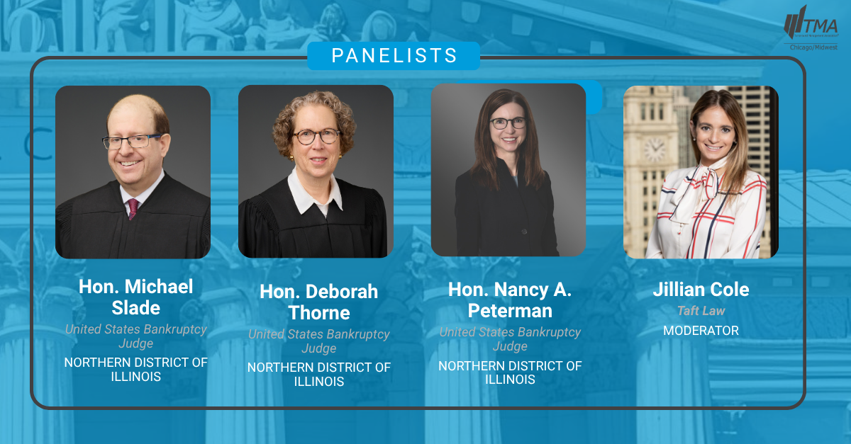 Join the TMA Chicago/Midwest Chapter for an engaging roundtable discussion with a distinguished panel of bankruptcy judges on the latest developments in restructuring and insolvency. This session will offer practical insights into emerging legal trends, strategic considerations shaping today’s distressed landscape, and a unique dynamic of veteran and new perspectives of the courtroom. Designed for attorneys, financial professionals, and turnaround experts, this program provides a exclusive opportunity to hear directly from the bench.